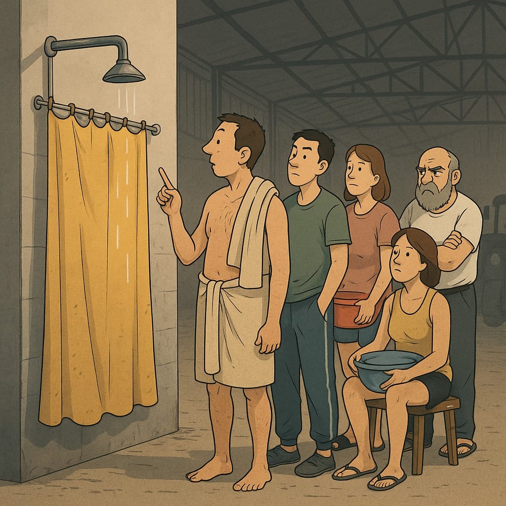 —Aquí, chicos, todos vivimos. Y en cajas, y hasta en la hierba —nuestros hermanos menores. Así que, a mear, no contra el muro, sino allá, al baño.