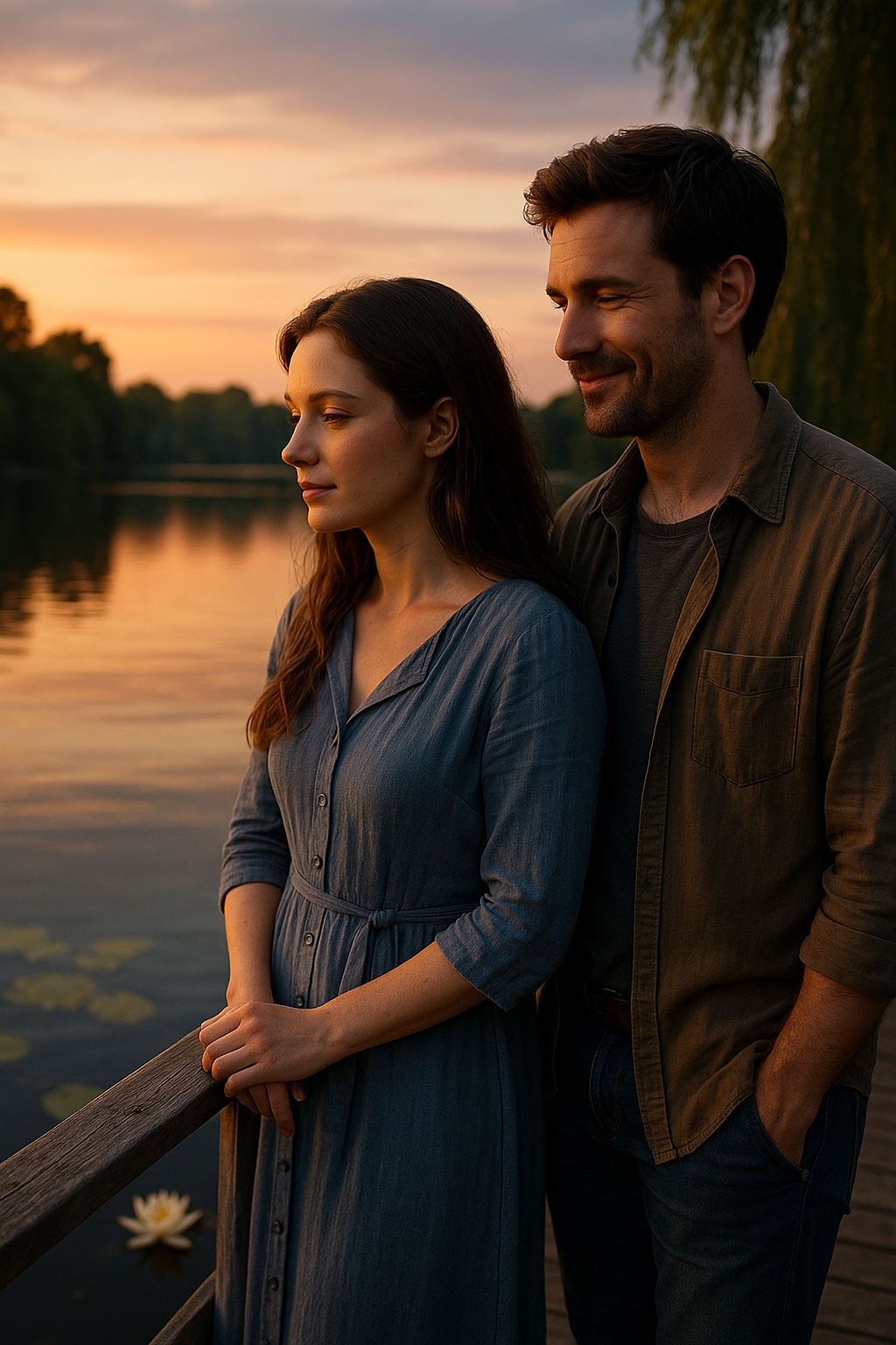 Дорожка вела их к озеру, знакомому и всё же изменившемуся. Вода была тёмной, густой, но спокойной, в ней отражались редкие облака и ветви ив. На мостике стоял мальчишка с удочкой, так серьёзно смотревший на поплавок, будто держал в руках весь мир.