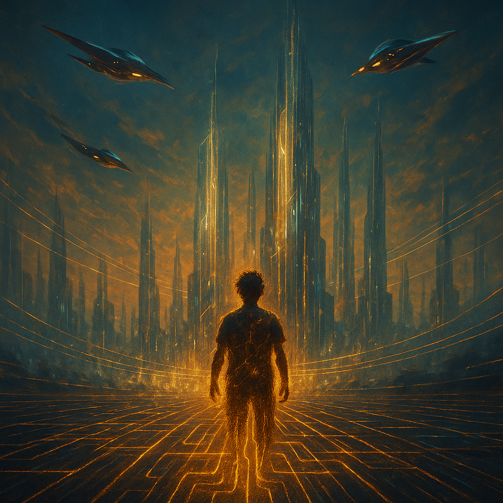 Там, в самом центре равнины, сиял огромный круг. Портал, больше всех, что я видел прежде. Он переливался огнём и холодом одновременно. Внутри мерцали смутные образы: семьи у костра, играющие дети, города будущего и снова — я сам, в капсуле, спящий.