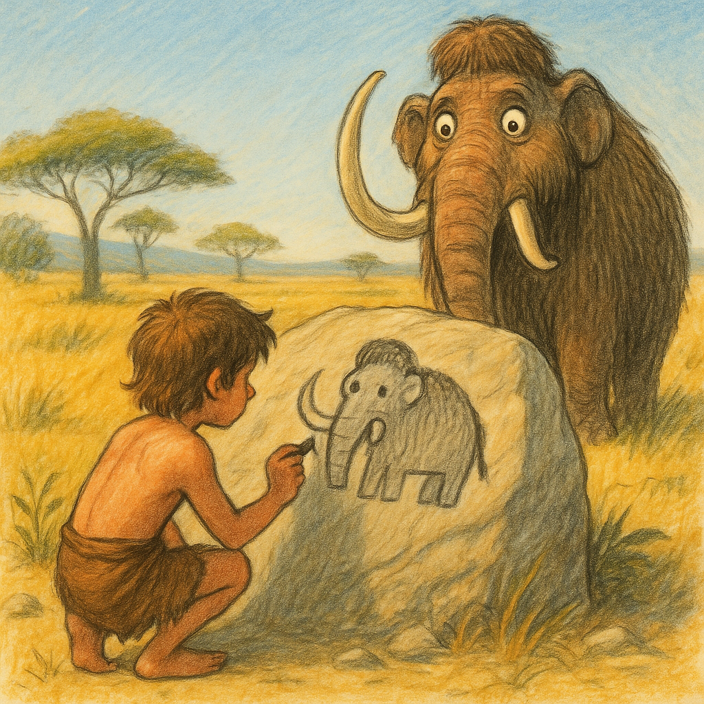 Зверь остановился. Его шаги стихли, лапы замерли. Он посмотрел прямо на мой рисунок, фыркнул так громко, что земля под нами содрогнулась, и сделал шаг назад. Не убежал — нет, просто отступил, словно понял, что перед ним не только дети с копьями, а нечто иное, невидимое, что-то, чего боялся даже он.