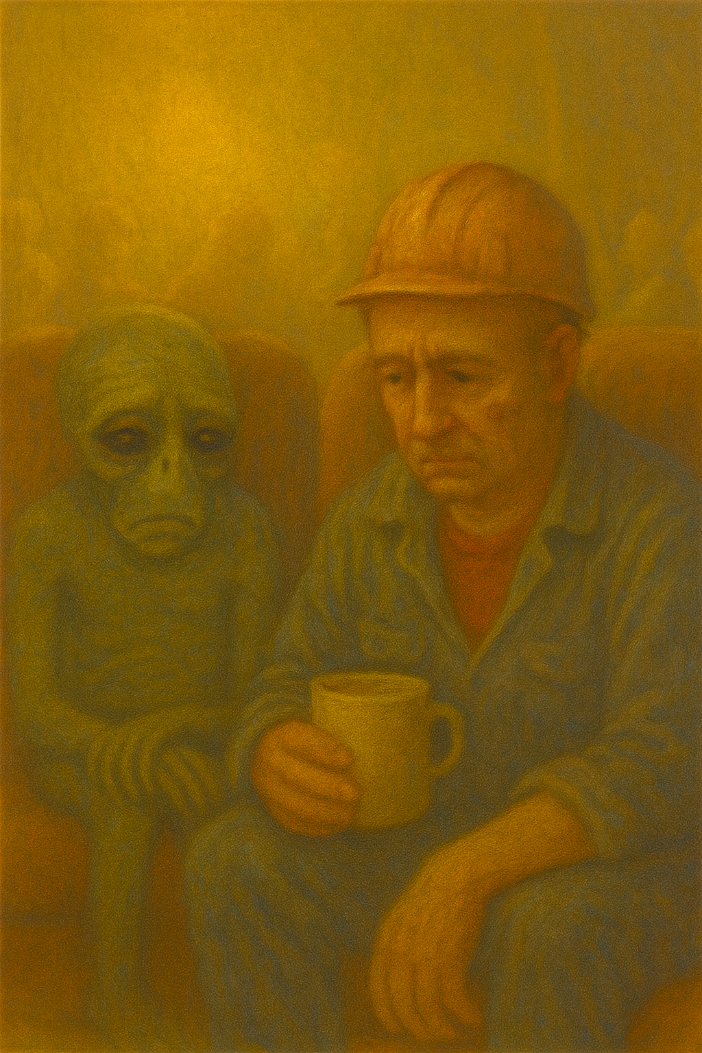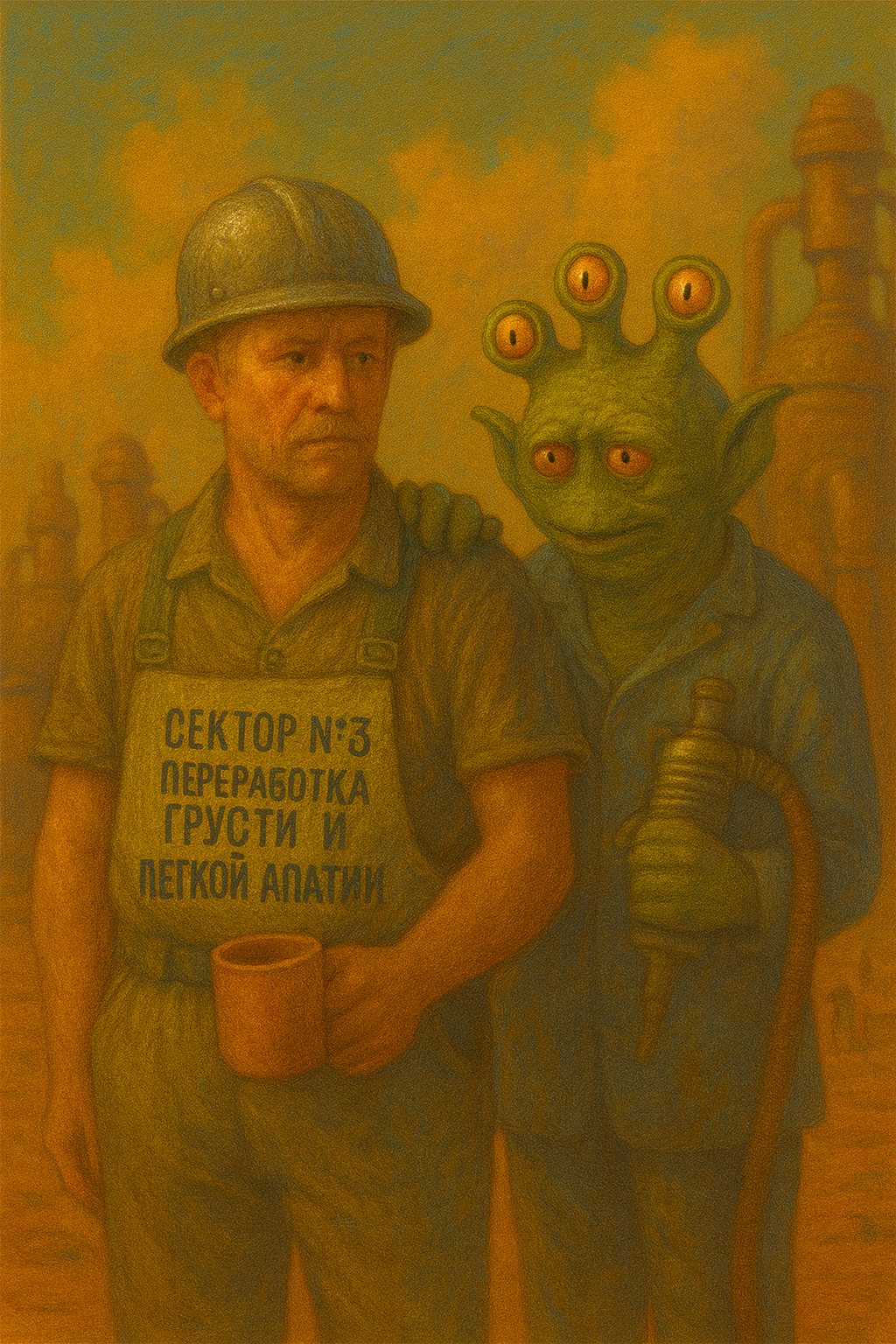 Прокопьёв стоял у ворот с кружкой в руках, в каске, которая явно пережила несколько эпох и не менее трёх революций. На спине у него красовалась надпись краской, от которой тянуло тоской по дому: «Сектор № 3. Переработка грусти и лёгкой апатии».