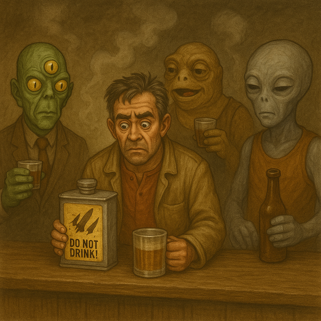 Инспектор тяжело вздохнул, произнёс «ещё один философ» и отправил его в сектор «созерцателей», где сидят те, кто так и не допил, потому что задумался, — но туда Пётр Егорович идти не хотел, потому что просветление он, может, и переживёт, а вот встреча с долгами — это всегда на трезвую голову, а значит, без прикрытия, — он сделал глоток синего пламени, в животе знакомо зашевелилась кнопка «сейчас вырубимся», кто-то закричал «не перегревайся, землянин», но было уже поздно: из него вырвался поток искр, над головой вспыхнула голограмма «алкогольная сингулярность достигнута», и мир открылся, как старый холодильник после новогодних праздников — ярко, шумно и с душком тайны.