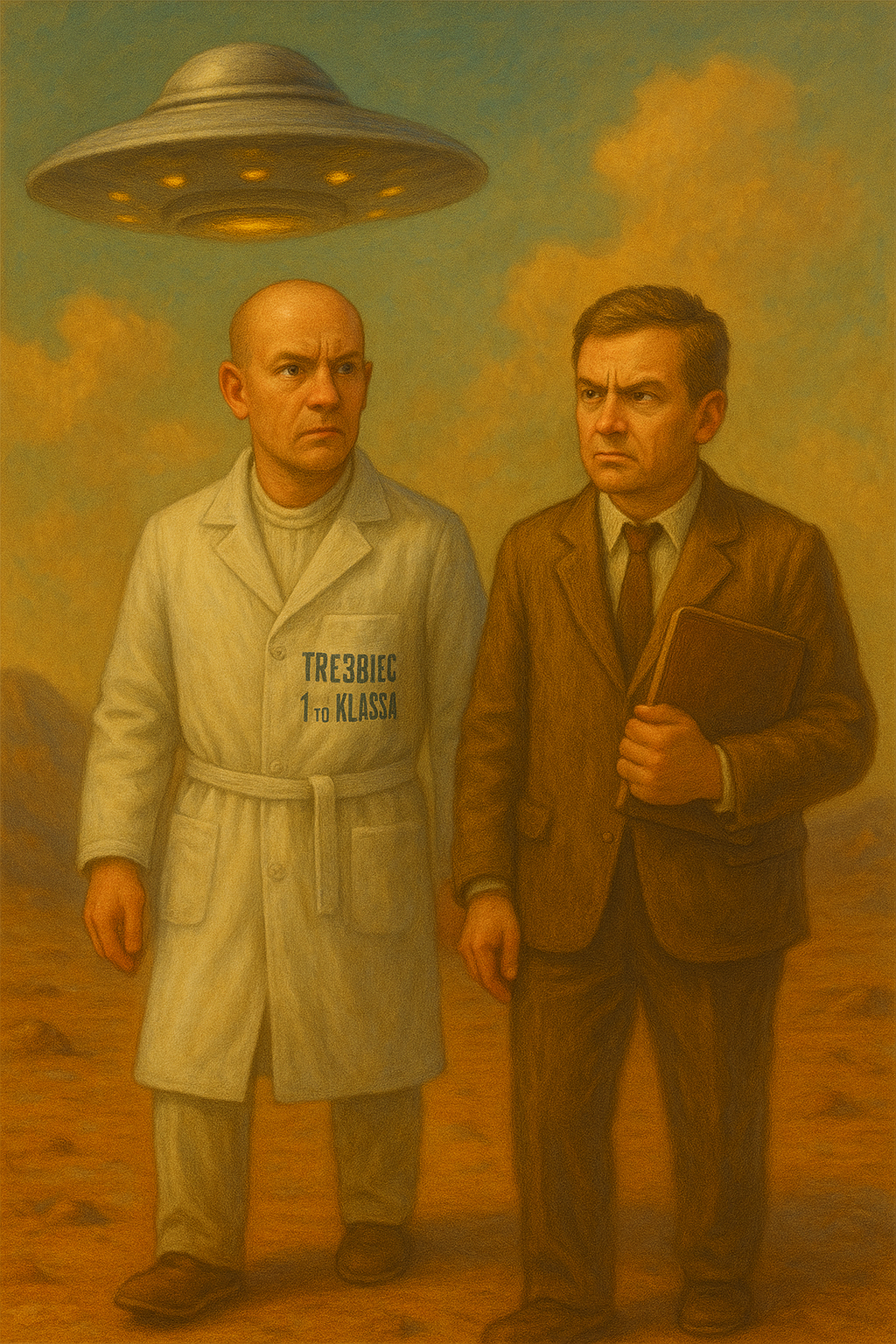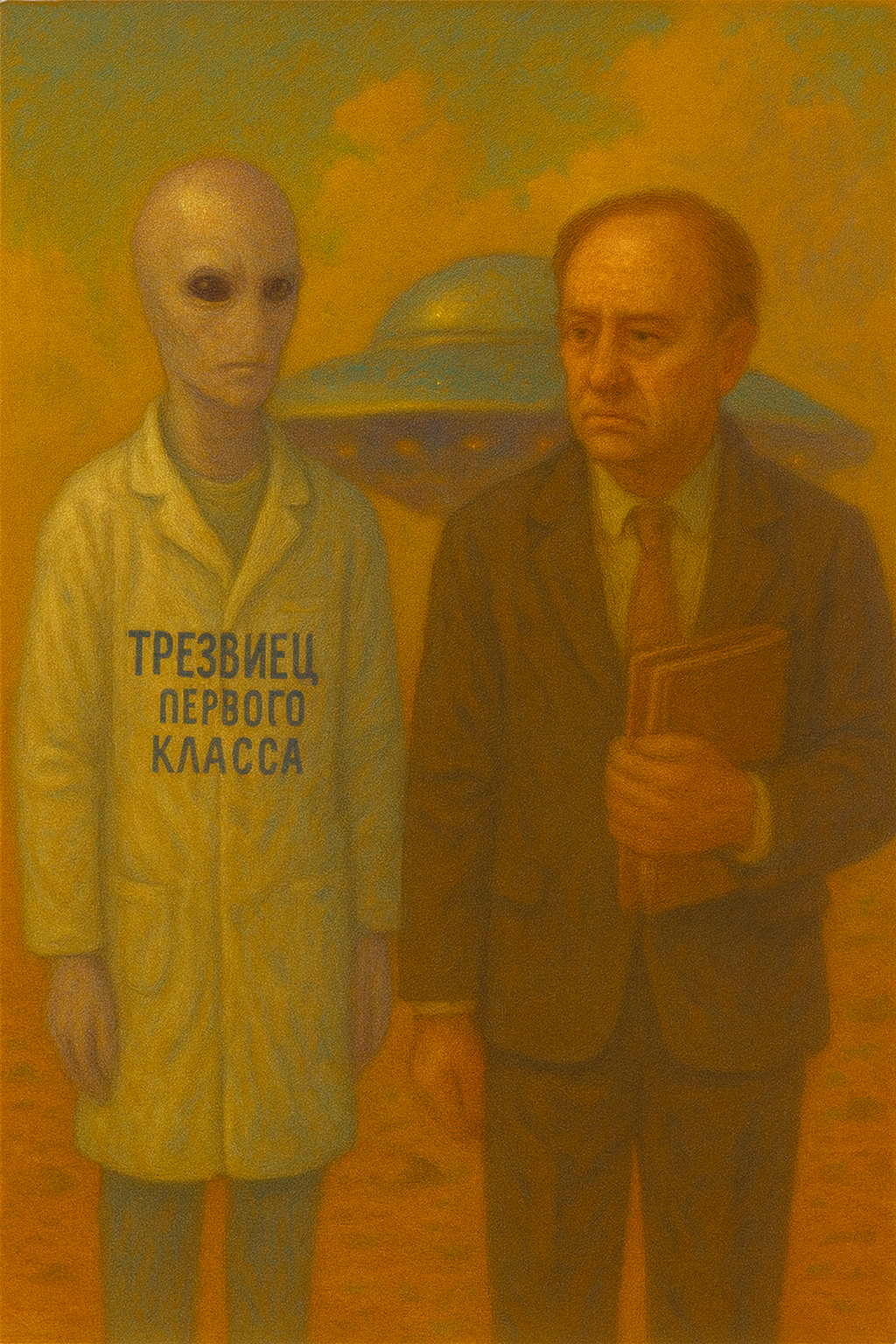 С блестящего диска спустились двое — один в халате с надписью «Трезвиец 1-го класса», второй с папкой и выражением лица «я вам не верю, но готов удивиться»,