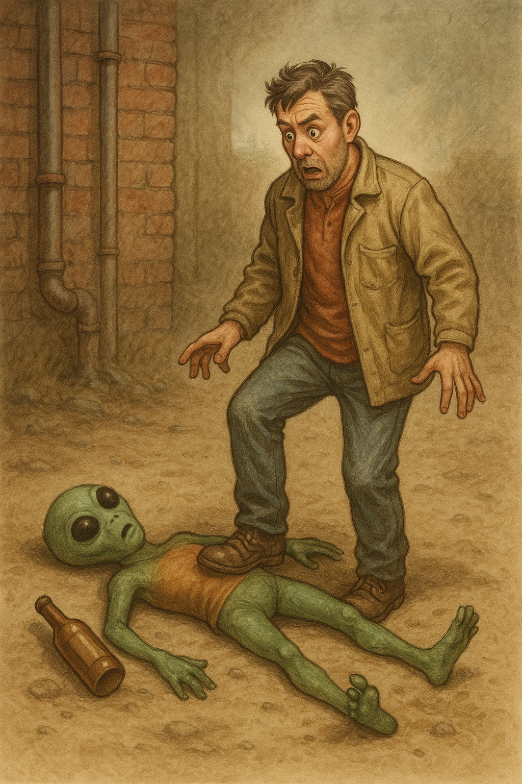 Рядом стоял его наставник — трёхглазый в заляпанном комбезе, с видом того, кто однажды понял смысл жизни, но не успел записать.